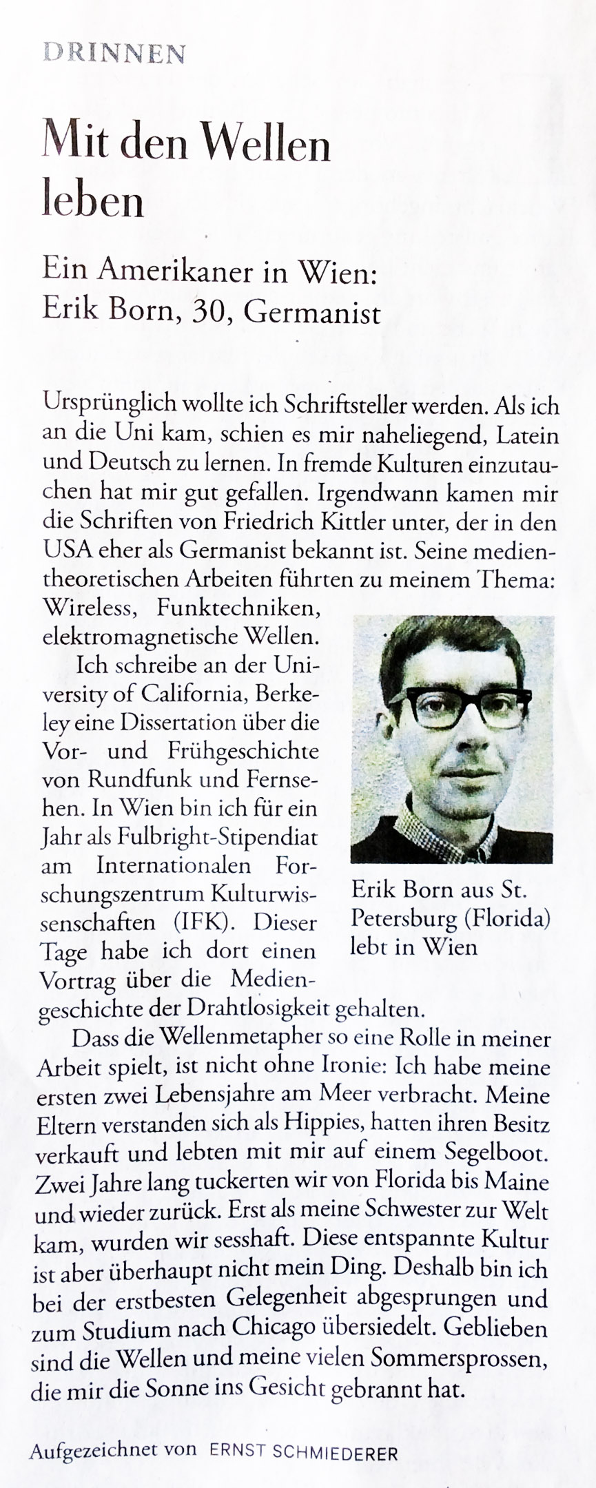 I also gave a more personal interview with Ernst Schmiederer for his column “Drinnen/Draußen” in the Austrian edition of Die Zeit (image below: “Mit den Wellen leben”). His interviews, either with Austrians living abroad or with foreigners living in Austria–all of which make for great reads–have been collected in the book Import/Export.